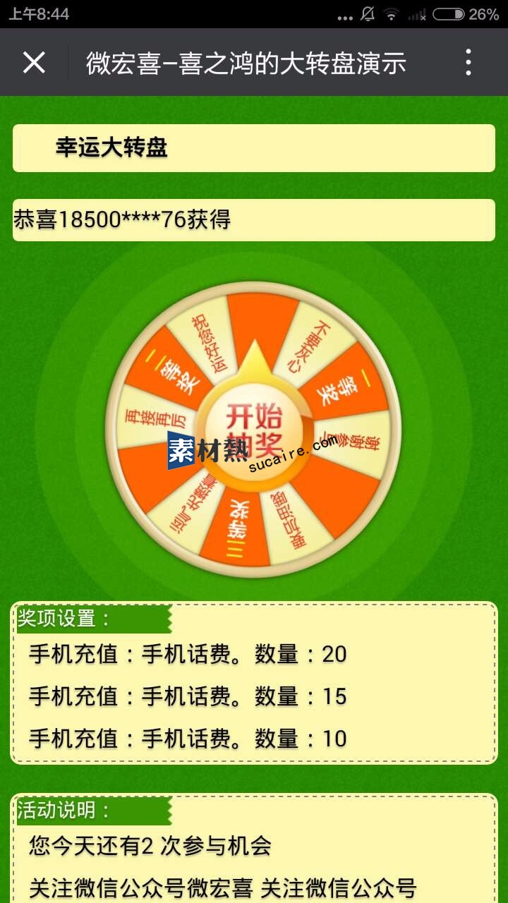 前台抽奖的转盘,可以独立使用,也可以绑定公众号后使用,奖品一共有三个等级,当点击抽奖按钮后,转盘会飞快的转起来,并根据概率算出中奖与否和所中奖品