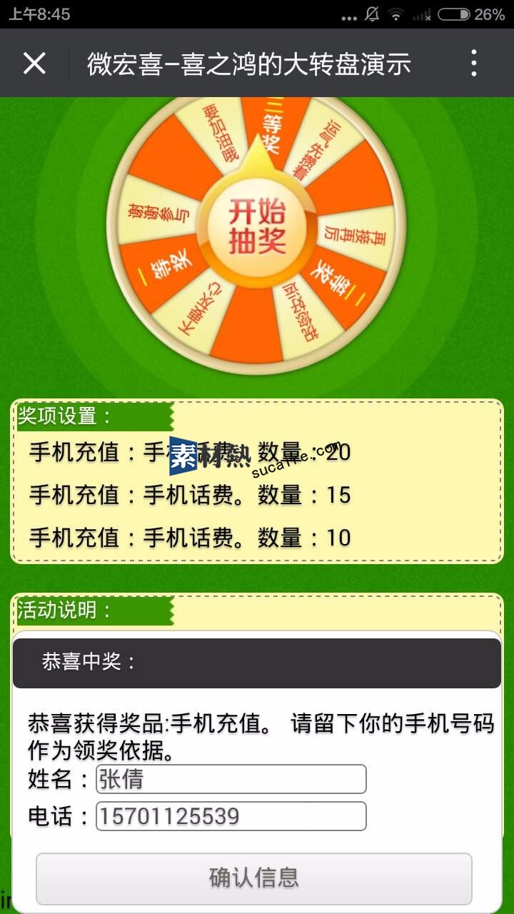 提示“恭喜您中了几等奖”,同时从下方弹出输入框,这个输入框包括姓名和手机号两个字段,当您输入完成后点击确认按钮后,系统会提示您提交成功。这样就完成了
