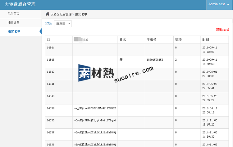 奖品的随机分配和信息的收集工作,系统后台清楚的记录了参加抽奖人的信息。后台可以调整各个奖品的中奖概率和奖品数量,可以调整每人每天的参加次数,以导出中